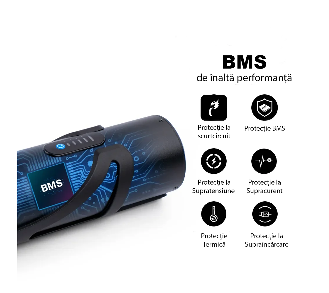 Bateriile echipate cu Sistem de Management al Bateriei (BMS) oferă o protecție multiplă de încredere. Acestea includ funcții esențiale precum protecția împotriva supratensiunii, protecția la supraîncărcare și descărcare excesivă, protecția termică și la scurtcircuit. În plus, bateriile sunt prevăzute cu protecție împotriva inversării încărcării și echilibrarea celulelor, asigurând astfel o funcționare eficientă și sigură pe termen lung.