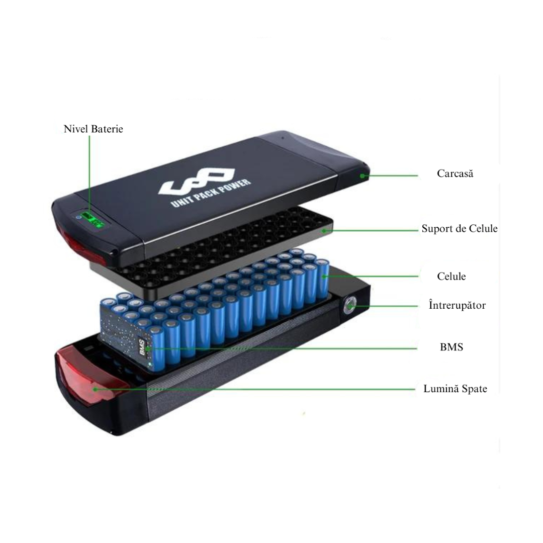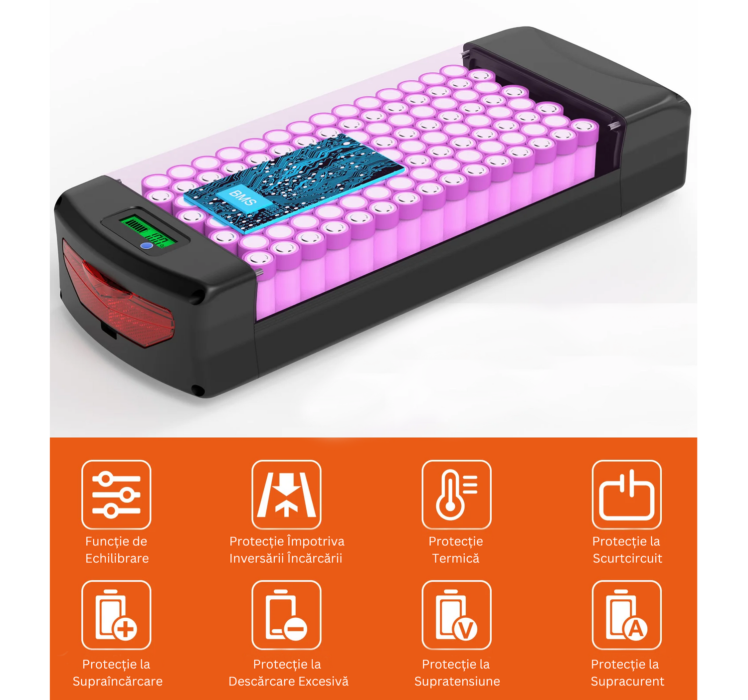 Bateria este protejată de o carcasă robustă, care găzduiește suportul pentru celule și celulele de înaltă performanță. Sistemul de Management al Bateriei (BMS) asigură siguranța și eficiența prin monitorizarea constantă a stării celulelor. Suportul pentru baterie este proiectat pentru a fixa solid bateria pe cadrul bicicletei, oferind atât securitate, cât și accesibilitate ușoară pentru încărcare și întreținere.