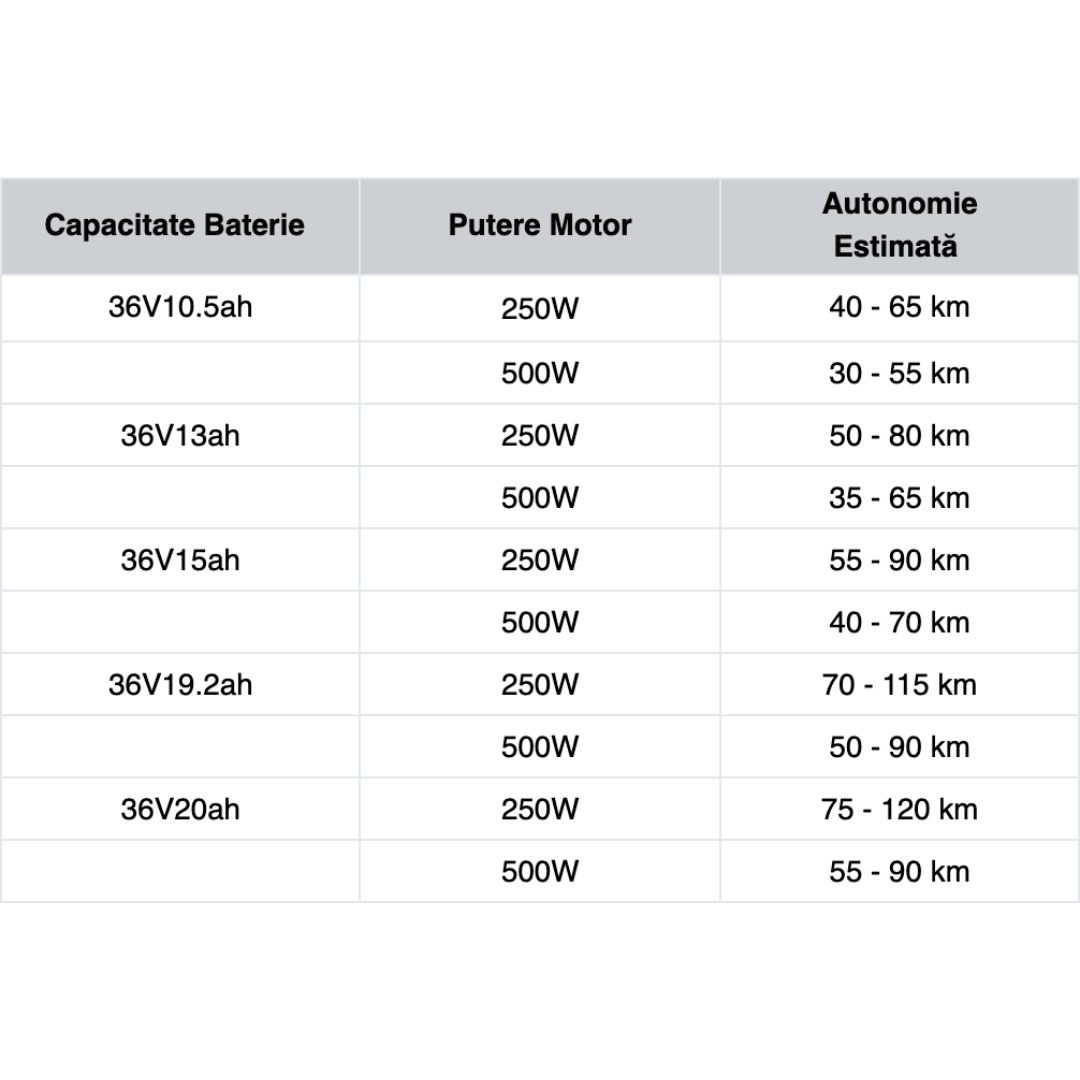 Pentru a asigura utilizarea maximă și eficientă a kitului de bicicletă electrică, este important să vă asigurați că puterea bateriei este mai mare sau egală cu puterea kitului. De exemplu, dacă aveți un kit de 36V 500W, va trebui să folosiți o baterie de cel puțin 36V 15Ah. (Capacitatea bateriei este calculată prin înmulțirea tensiunii cu capacitatea în Ah, adică 36V x 15Ah = 540Wh, care este mai mare decât puterea kitului de 500W).